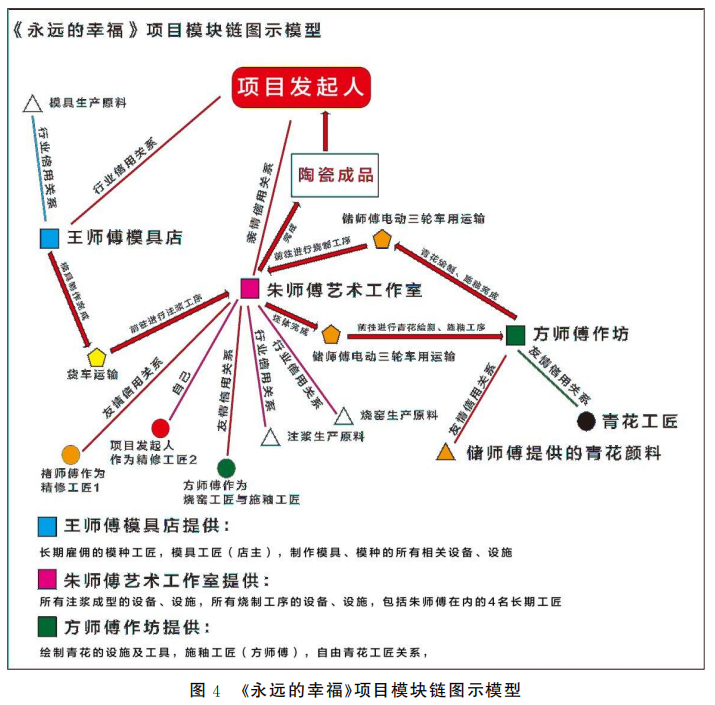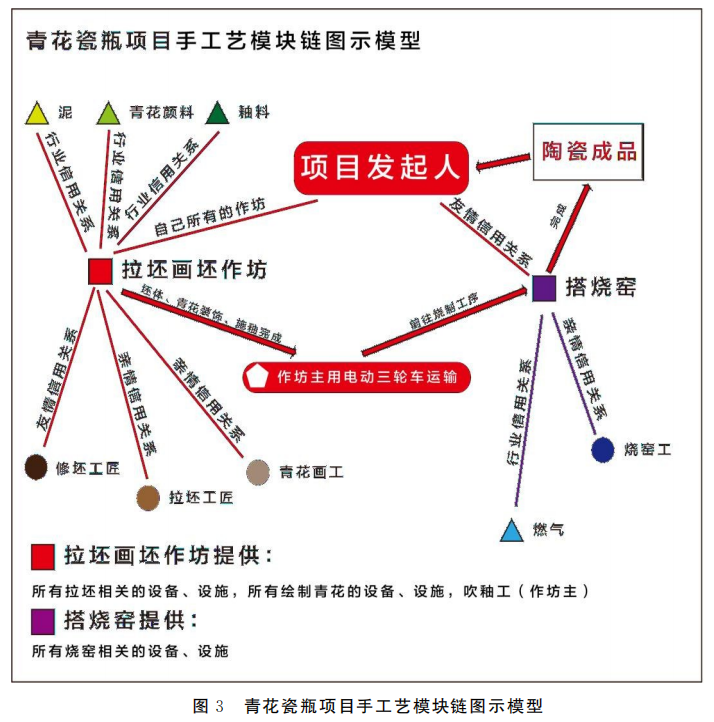 笔者以储师傅作坊生产青花瓷瓶的生产项目作为原型,绘制了一个假设的青花瓷瓶项目手工艺模块链图示模型(见图3):