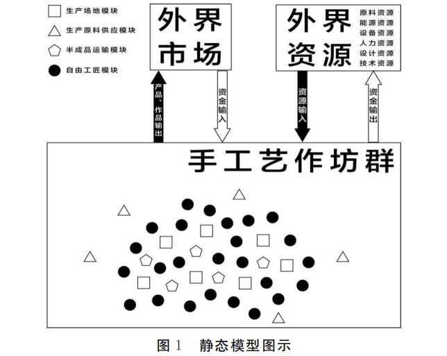 笔者提出的手工艺模块链产业模式中,有两种组成部分,一个是手工艺模块,一个是连接模块的链条。为了对这个产业模式进行解释,笔者将建立两种模型,一种是静态模型,这个模型显示的是所有产业模块都为“待机”状态的静态产业格局。还有一种是动态模型(手工艺模块链模型),在动态模型中会出现一些静态模型没有的部分。