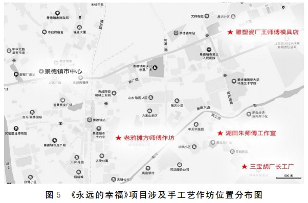 在有了生产任务之后,才会通过组建产业模块,形成具体手工艺模块链,进行生产的全过程被笔者称为生产项目。生产项目是多样的,可以是持续性的量产,也可以是小批量定制,还可以是单件的艺术品。虽然艺术品一般被认为是由艺术家创作,而不是被艺术家生产,这是因为艺术品的制作过程需要大量的创意,生产被认为是重复的劳动。但是在景德镇的模块链产业模式中,提供创意的艺术家只是生产环节中的一部分,所以整个艺术品的制作过程也被称为生产项目。在景德镇瓷文化丛微型社区的研究中,往往只把生产项目作为某个具体手工艺作坊集散地内某个具体作坊,借助这个集散地内资源完成日常工作,虽然有很多这样的情况,但是还有更多更加灵活的陶瓷生产行为是跨集散地的,也不由作坊主导。比如笔者将要进行分析的一个艺术家主导的艺术品生产项目个案,是由位于雕塑瓷厂的某模具作坊、位于老鸦滩的某画瓷作坊和位于湖田的某陶艺工作室共同组建的生产链完成的,模具和半成品在这三个手工艺作坊/工作室集散地运输,不拥有作坊和工作室的艺术家却是这个项目的主导人。
