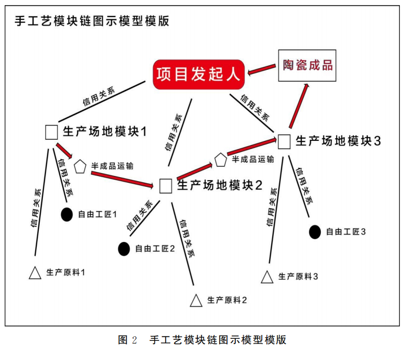 在手工艺模块链图示模型模版(见图2)中,可以看到本来“待机”状态的产业模块通过信用关系连接起来,产生一条个性化的生产链(红色箭头代表生产顺序)。项目发起人一般是项目的主要关系枢纽,生产场地在所有产业模块中作为每个生产流程的中心,聚集自由工匠和生产原料。不仅如此,项目发起人还提供了产品设计,也提供了产品的市场,所以在手工艺模块链图示模型当中不需要单独体现设计和市场。一般来说,项目发起人主要和生产场地模块的经营者对接,每个生产场地模块都可能有自己熟悉的自由工匠和生产原料供应者,但是在一些有特殊生产要求的项目中,项目发起人也会用自己的关系网提供自由工匠和生产原料,并且很多时候项目发起人自身就会以自由工匠的形式与场地模块连接。项目中所有产业模块的服务都由项目发起人支付,项目发起人在项目结束时获得所有生产出来的陶瓷成品。至于这些陶瓷成品如何处置,一般都由项目发起人决定,而且因为项目发起人支付所有生产费用,所以产生了一个封闭的循环,所以描述大部分手工艺模块链的模型是可以不用考虑外界市场的。